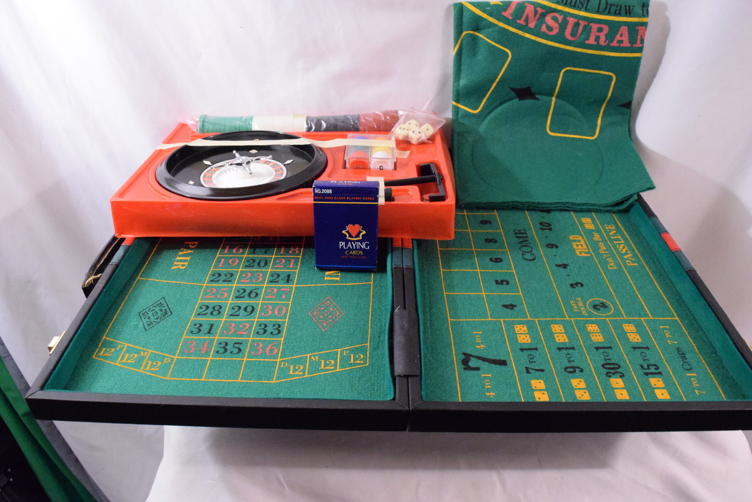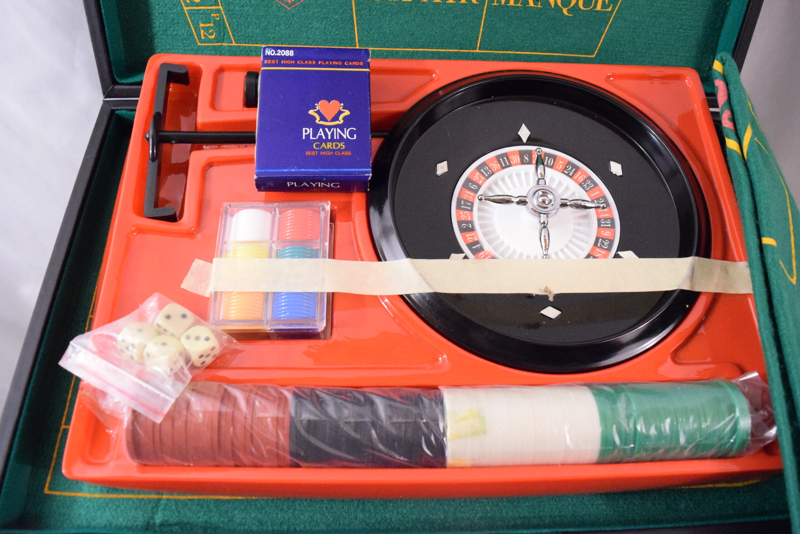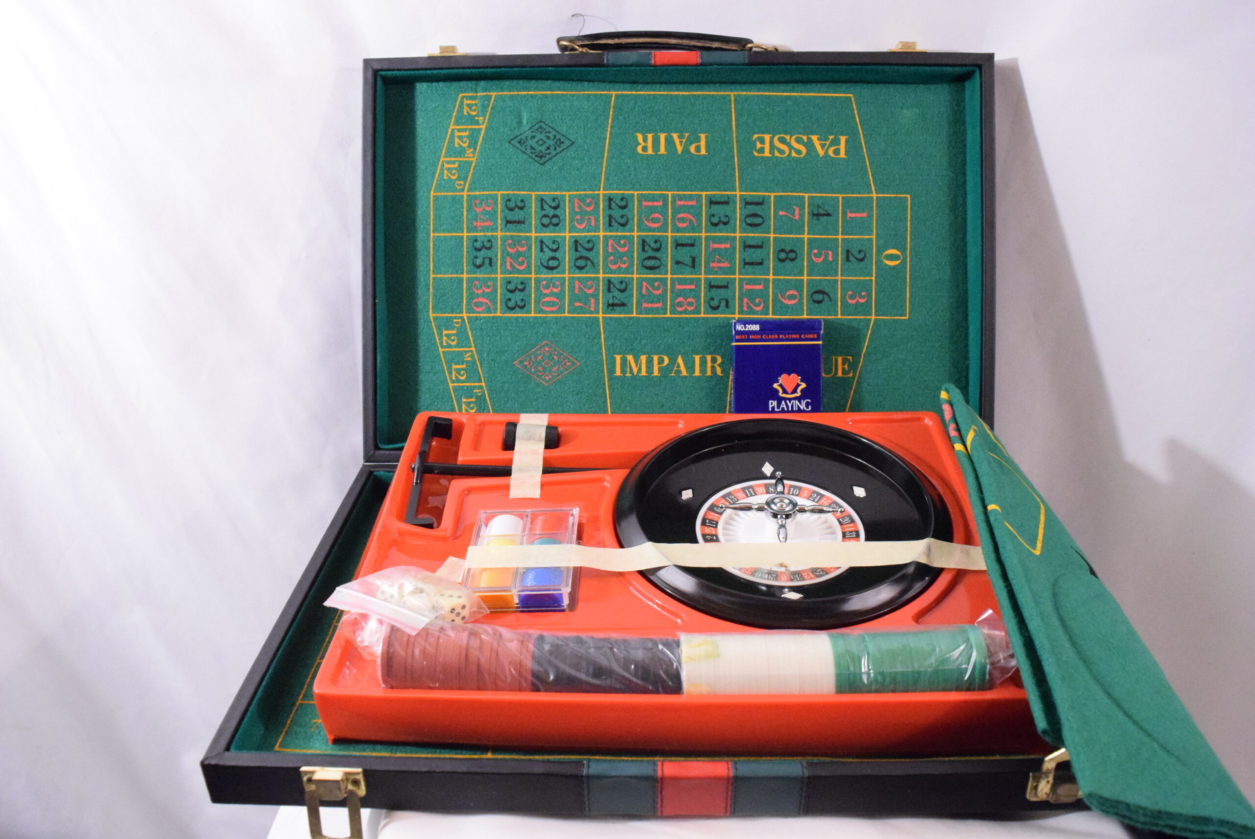 This vintage portable casino set includes a vinyl case containing roulette, craps, baccarat, and black jack games. The compact size makes it convenient for travel or use at home, measuring 18 x 11 inches when closed and 18 x 22 inches when open. Originating from Taiwan, this set is a collector’s item with a loose hinge on the case but overall in good shape. Perfect for casino enthusiasts looking to enjoy classic games on the go.