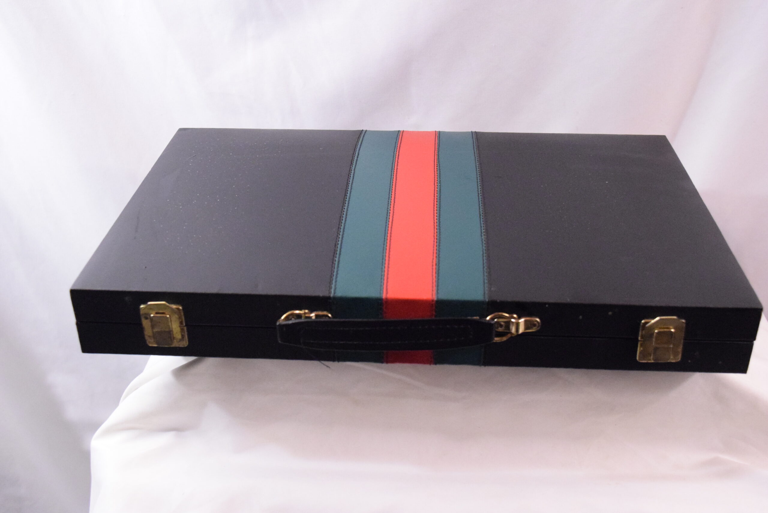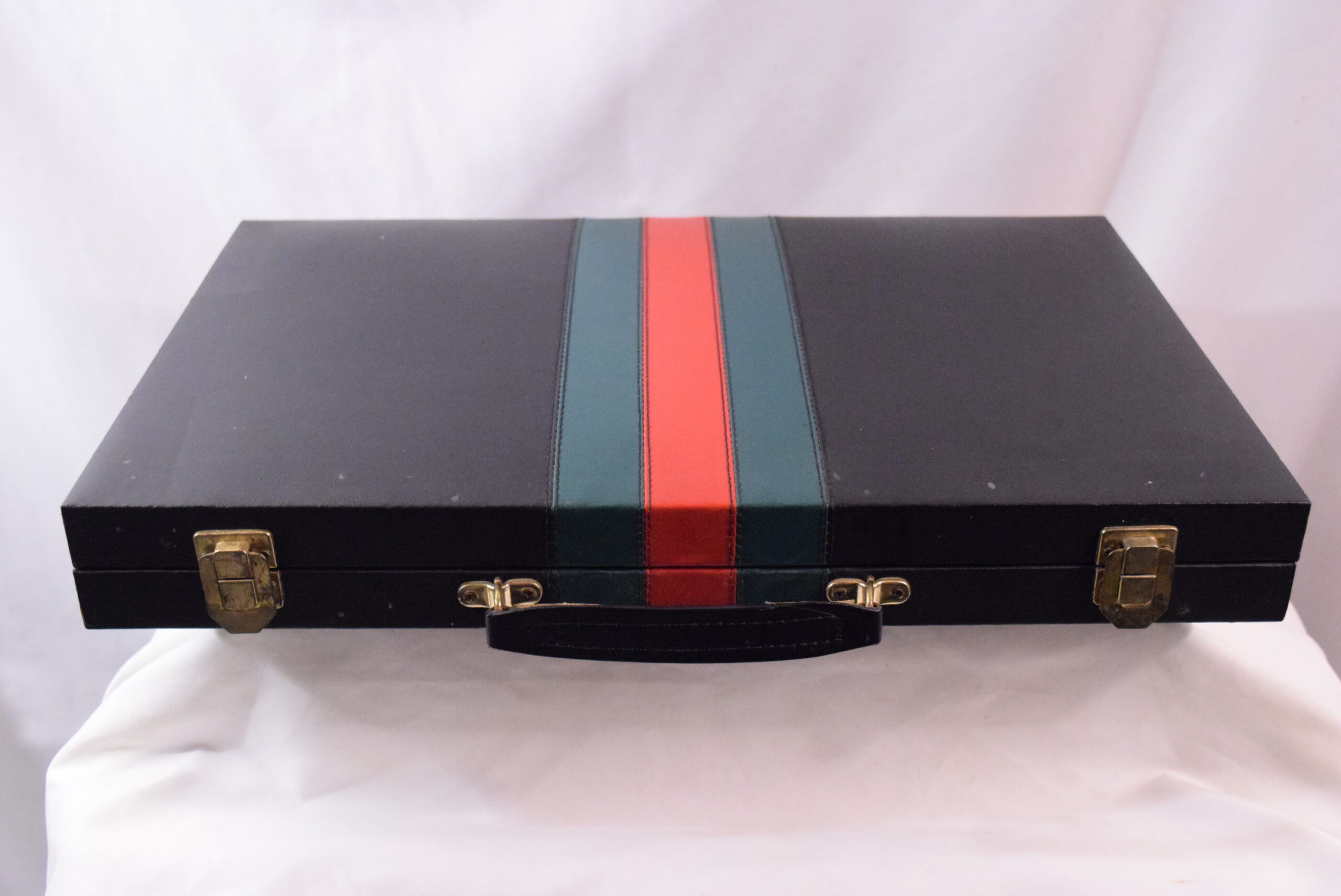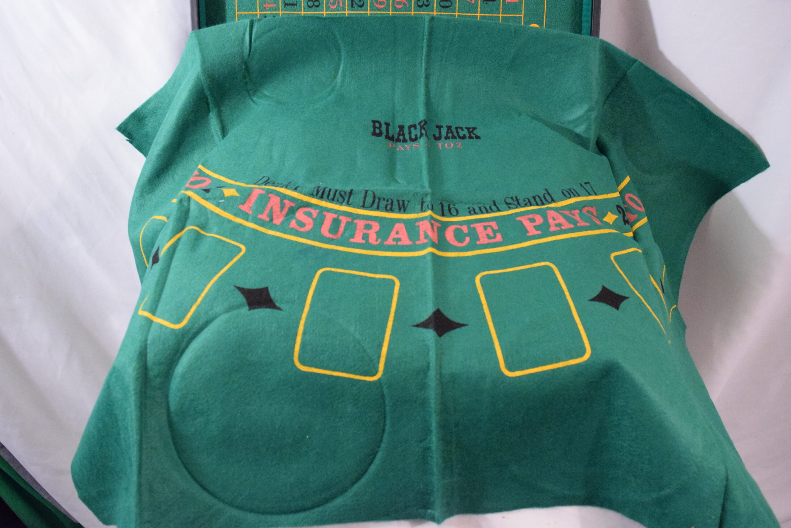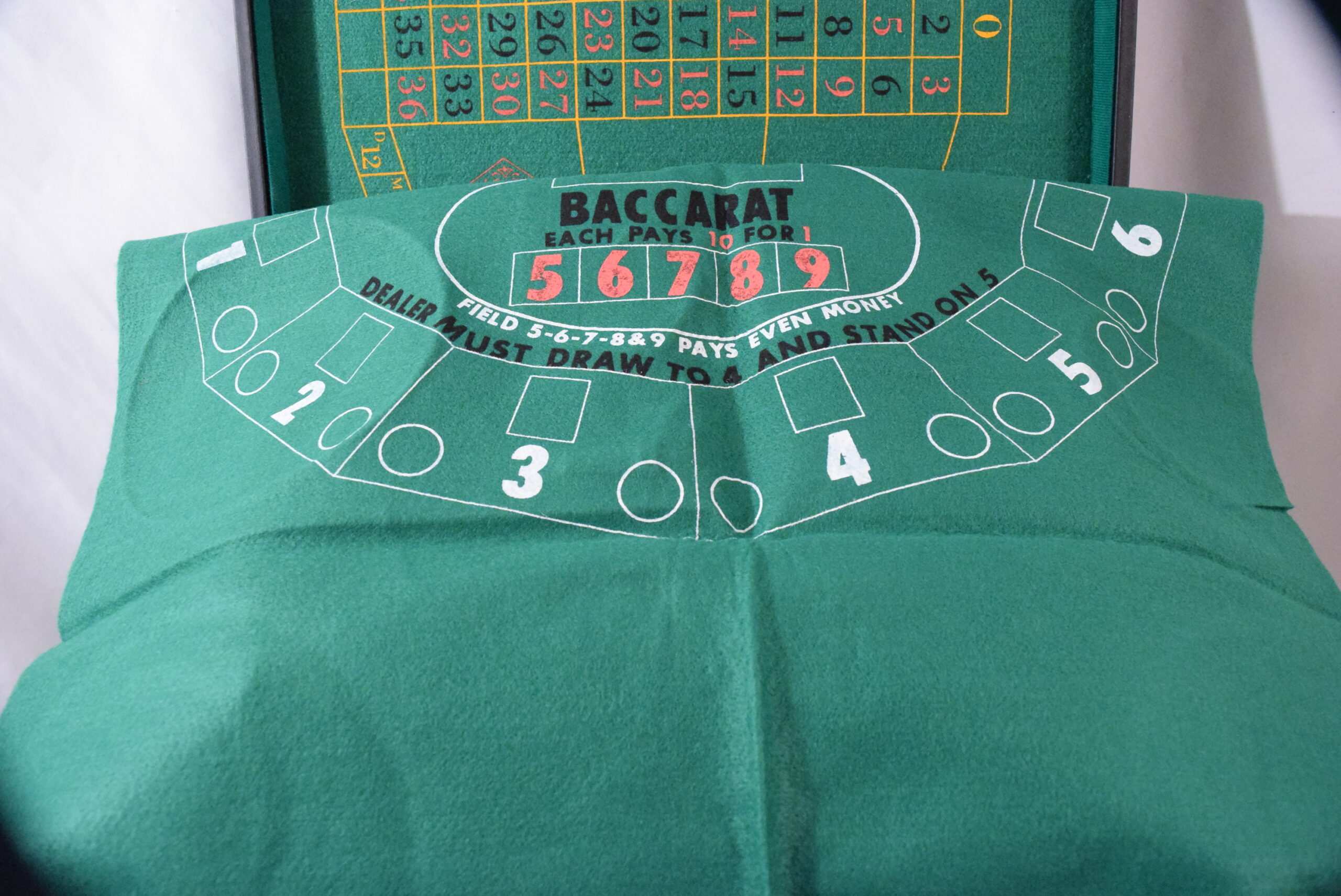 This vintage portable casino set includes a vinyl case containing roulette, craps, baccarat, and black jack games. The compact size makes it convenient for travel or use at home, measuring 18 x 11 inches when closed and 18 x 22 inches when open. Originating from Taiwan, this set is a collector’s item with a loose hinge on the case but overall in good shape. Perfect for casino enthusiasts looking to enjoy classic games on the go.